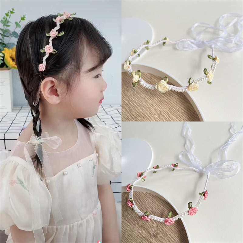 Kid's Romantic Rose Pearl Satin Hairband 2023 Trendy Sweet Floral Headband