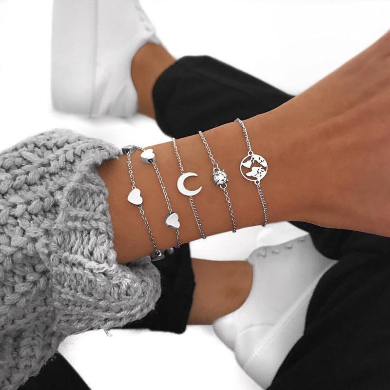 Multi-layer Gold-plated Heart and Moon Bracelet Set for Women