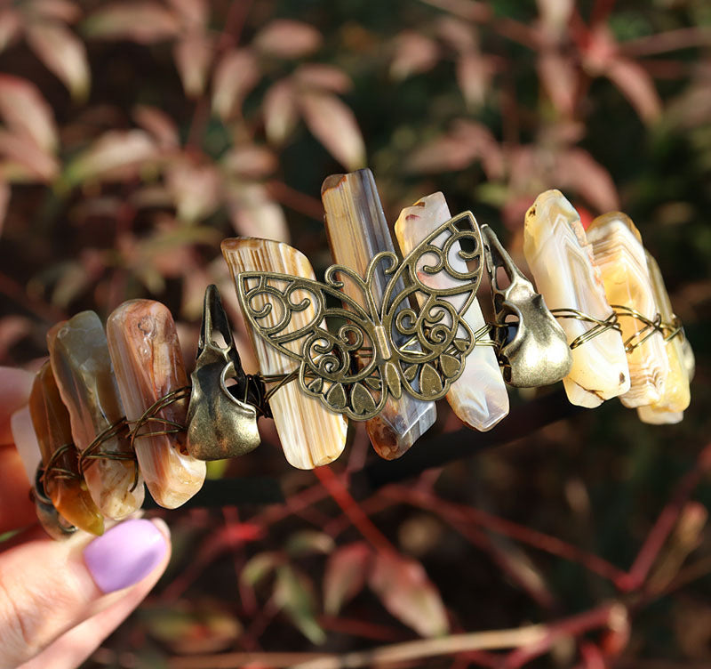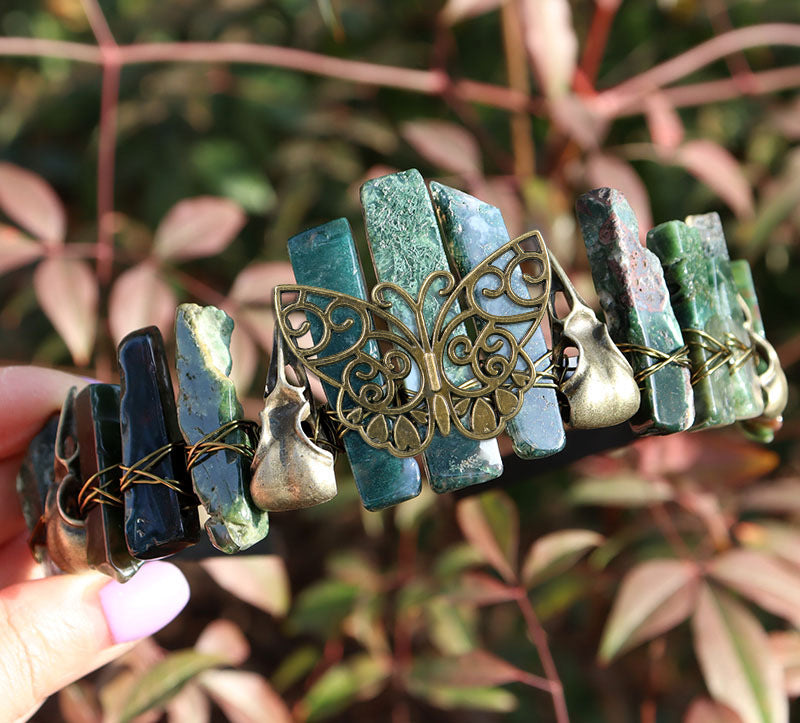 Aquatic grass agate, ancient green crow, butterfly, black headband + ancient bronze line