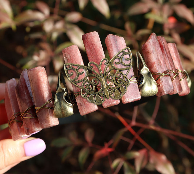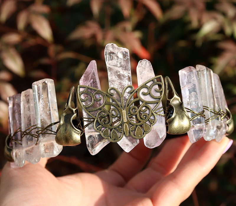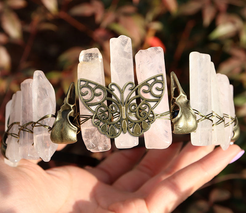 Pink quartz ancient green crow butterfly black headband + ancient bronze line