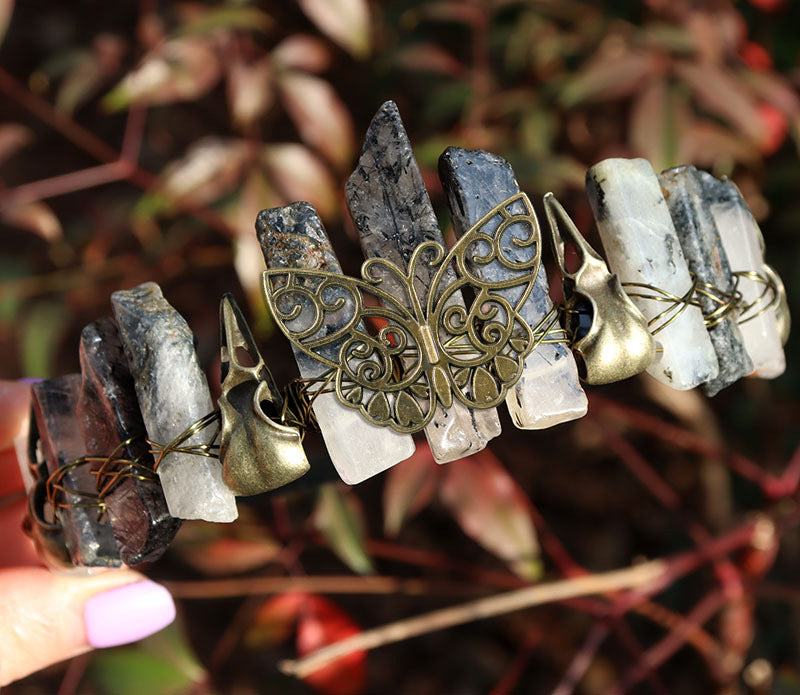 Gray labradorite, ancient green crow, butterfly, black headband + ancient bronze line