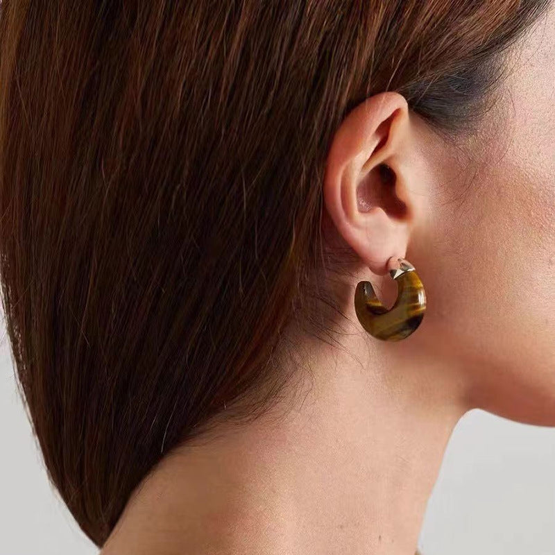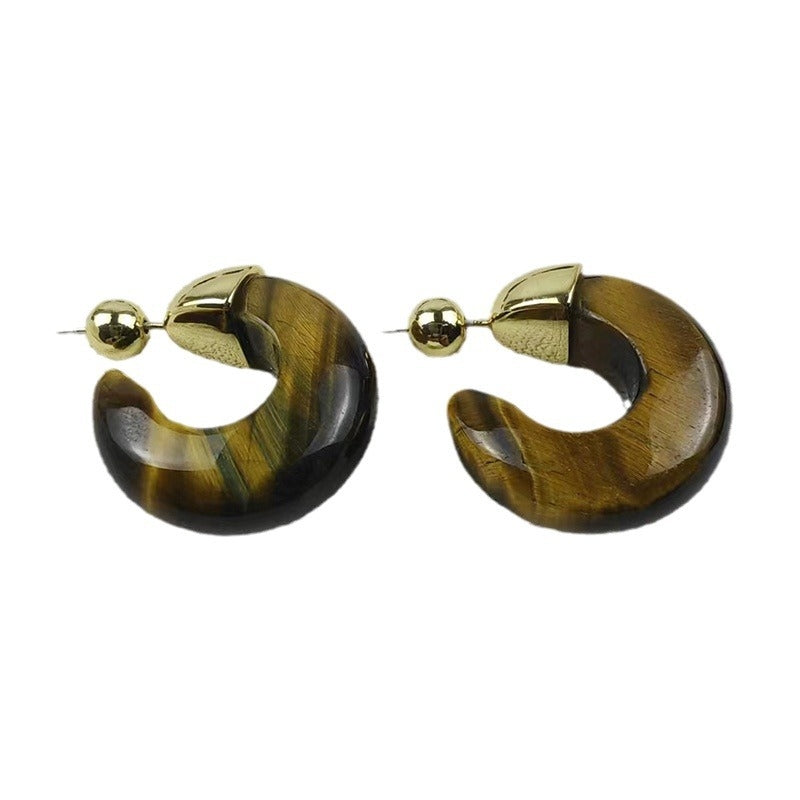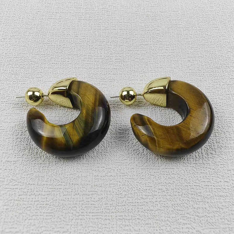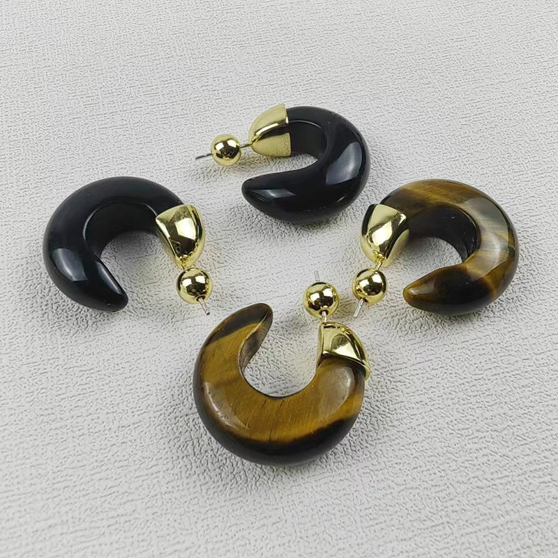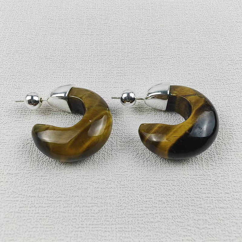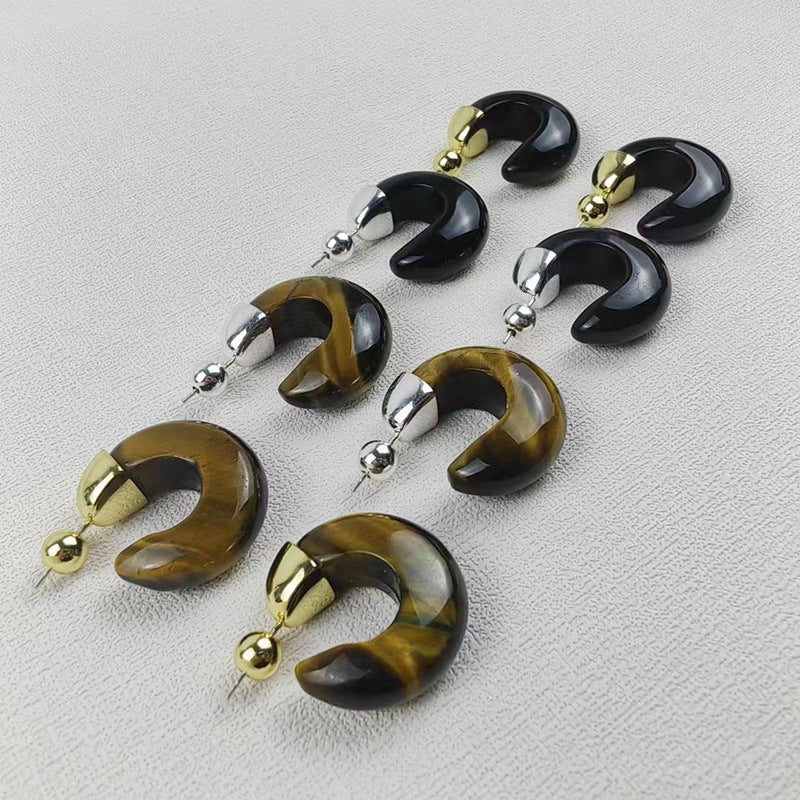 Retro Geometric Agate and Black Onyx Tiger Eye Stud Earrings - Minimalist S925 Silver Needle C-Shaped Design