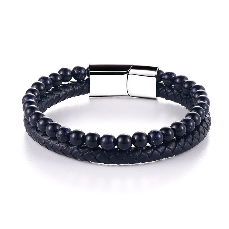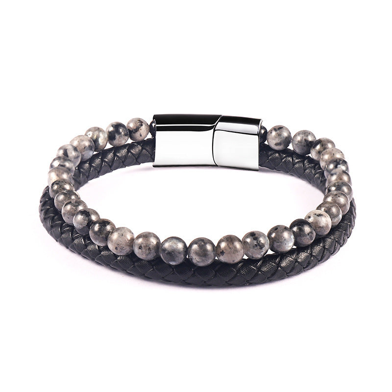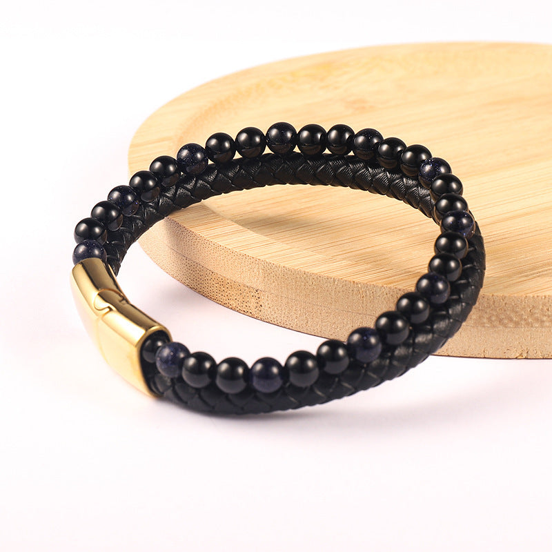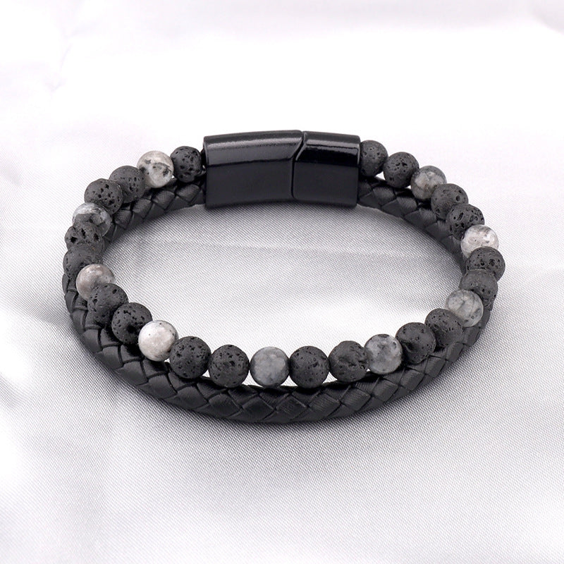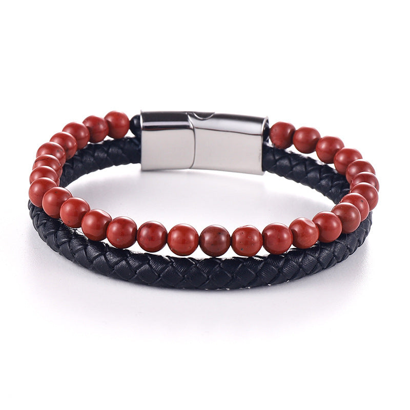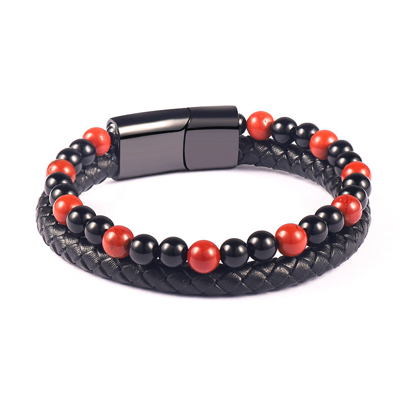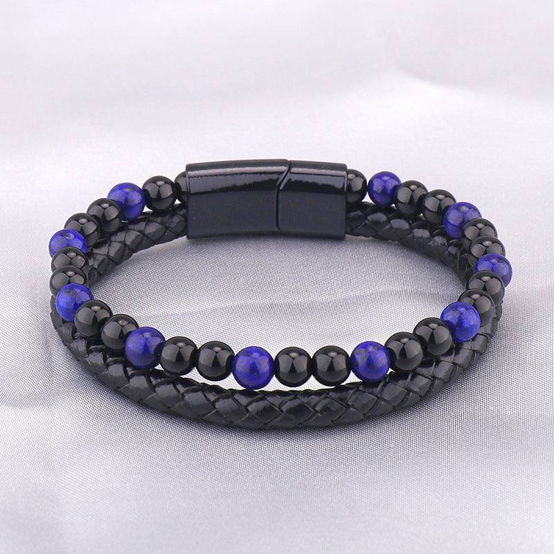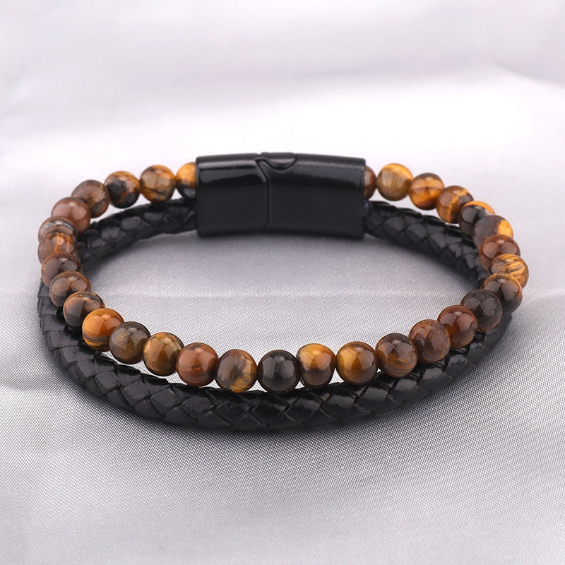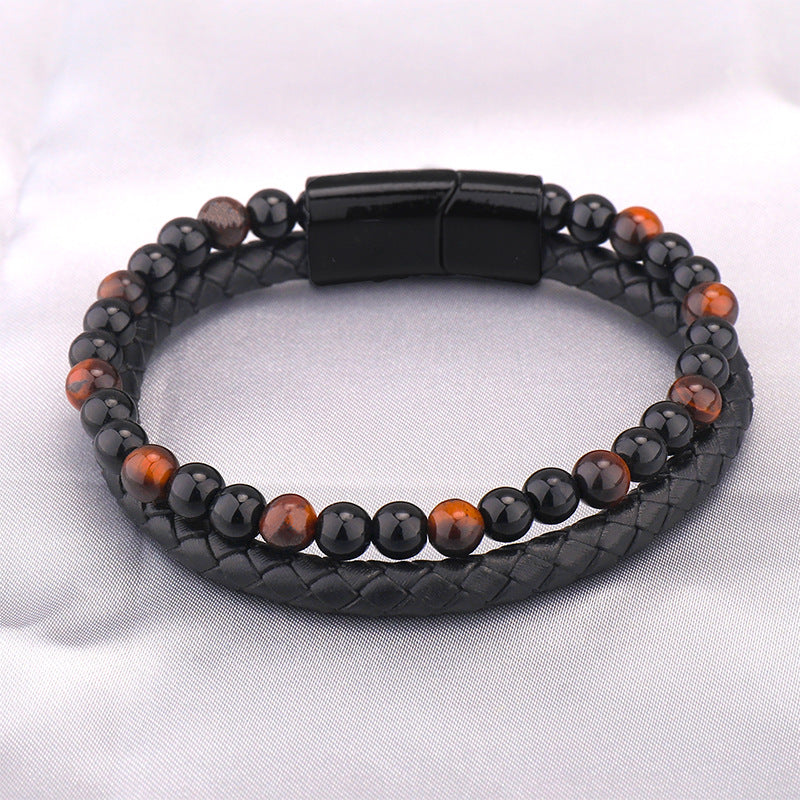 Retro Round Alloy Beaded Leather Bracelet with Natural Stone Tiger Eye and Agate