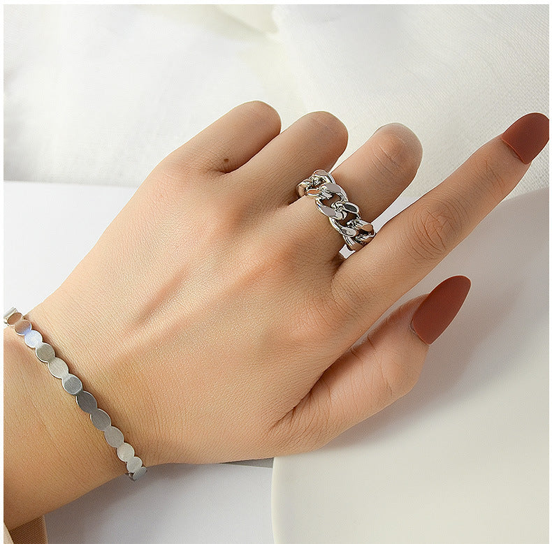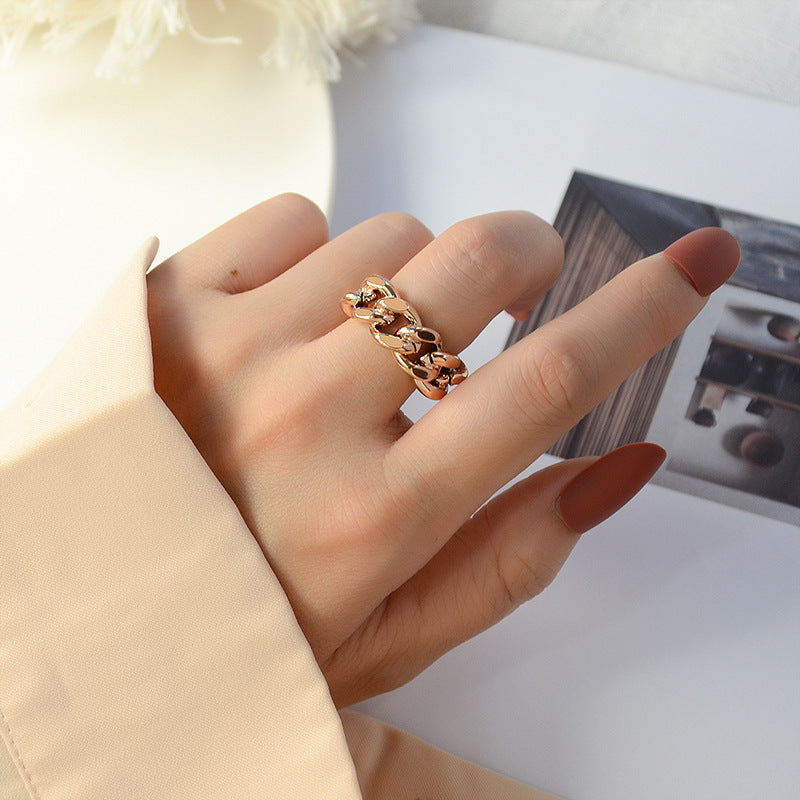 Retro Minimalist Hollow Twist Open Titanium Steel Ring with Chain Design, 18K Gold Plated