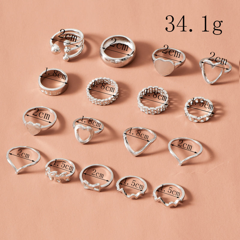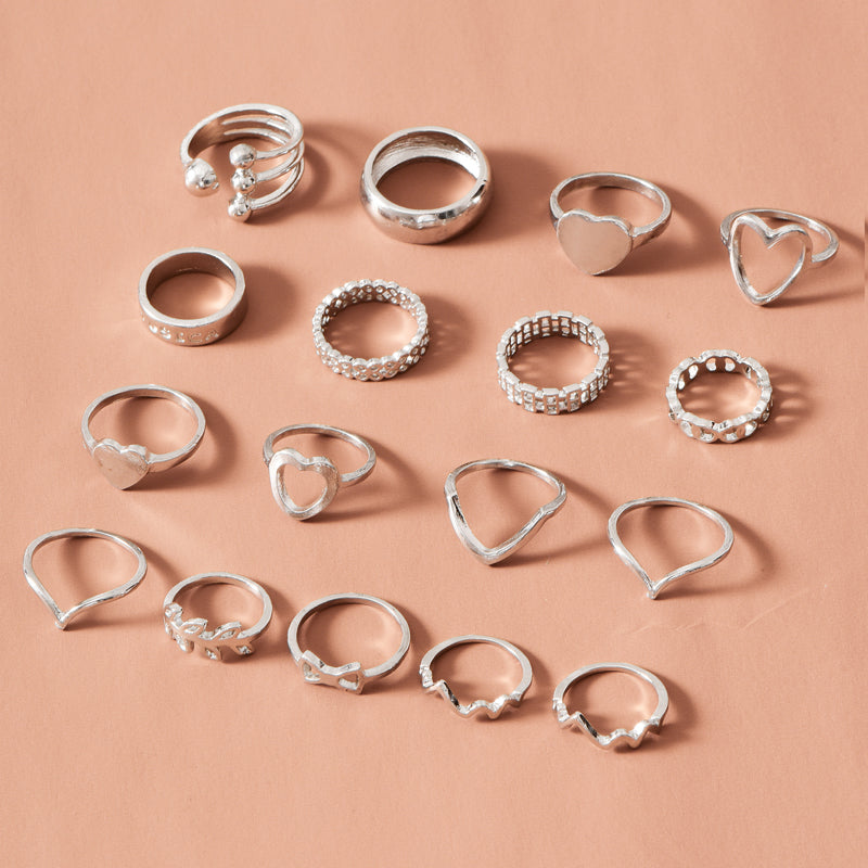 Retro Fashion Heart and Leaf Ring Set - 17 Piece Jewelry Collection