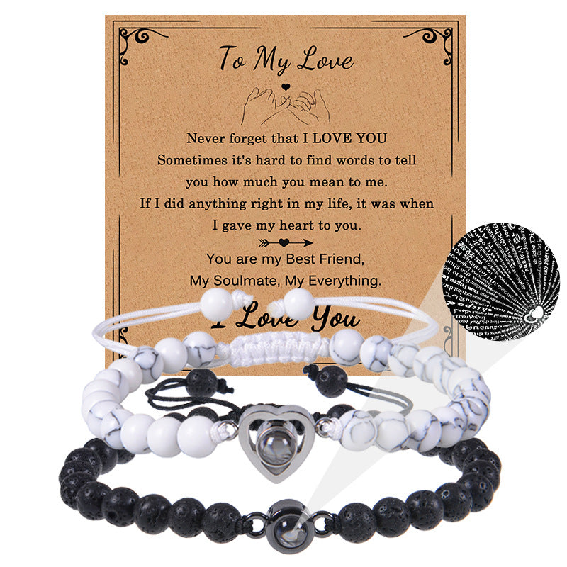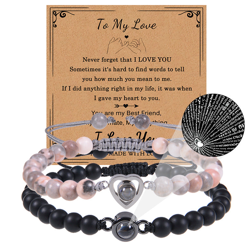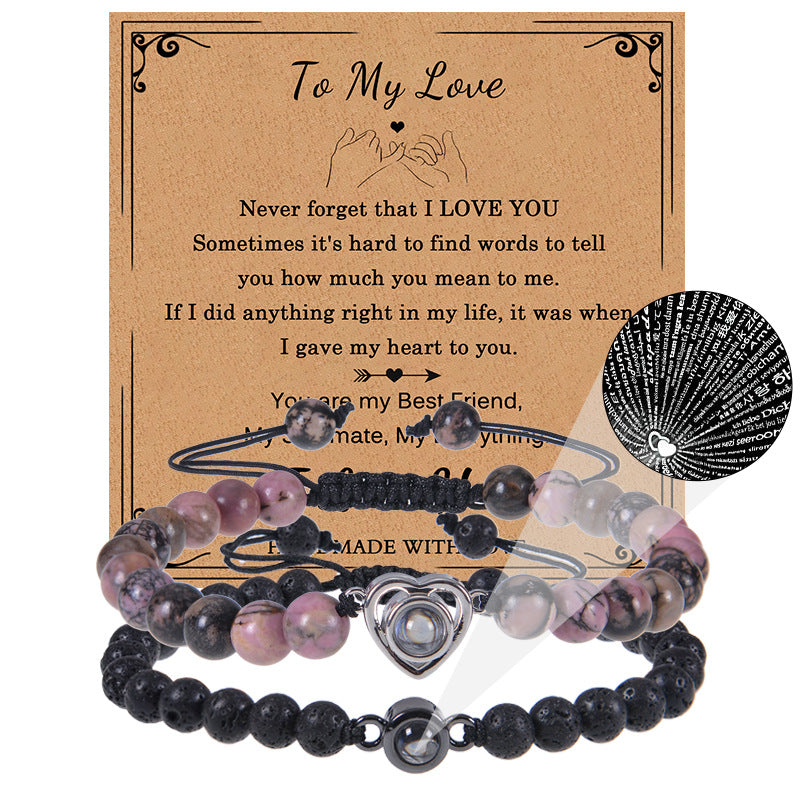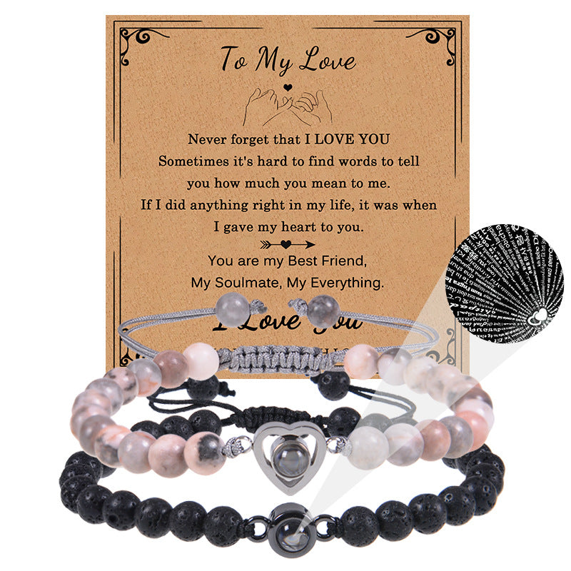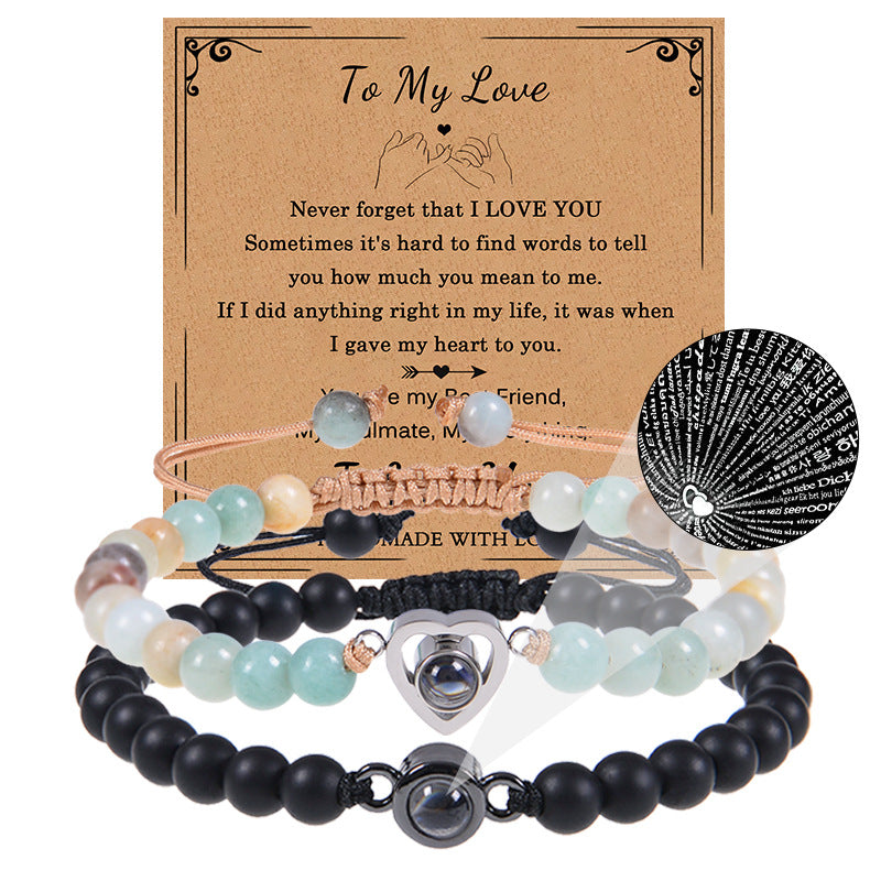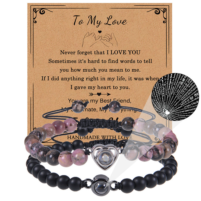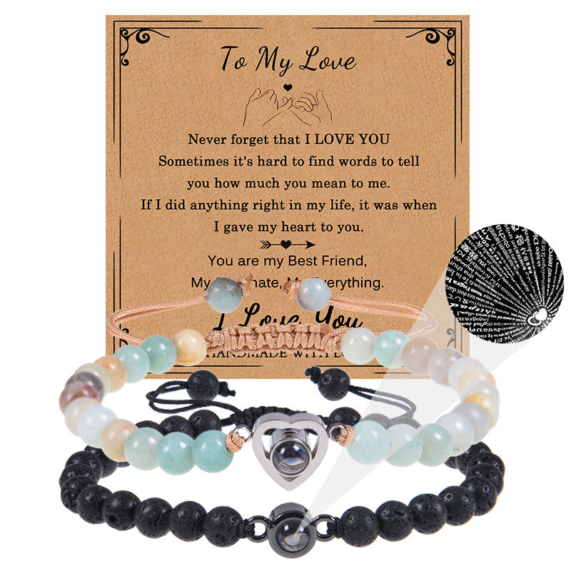 Romantic Heart Shape Natural Stone Projection Bracelets with 100 Languages Card Gift Set