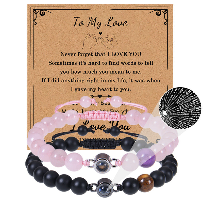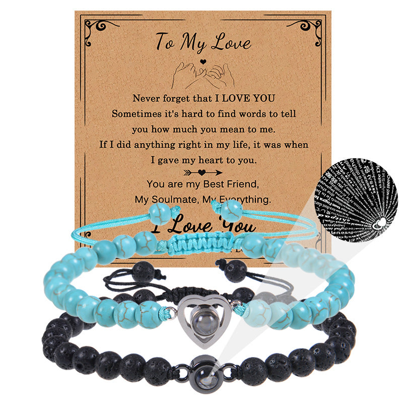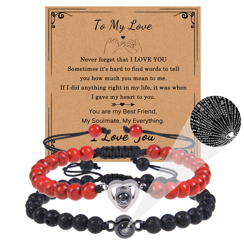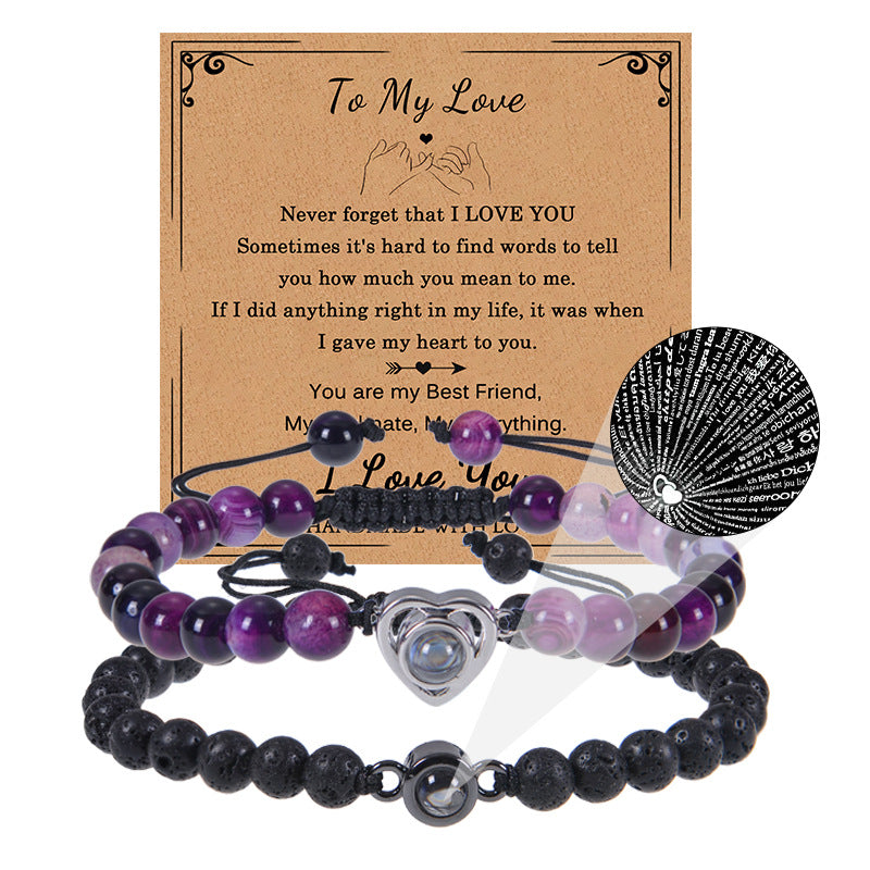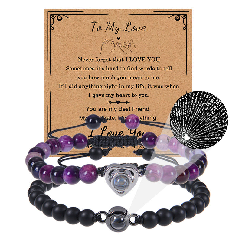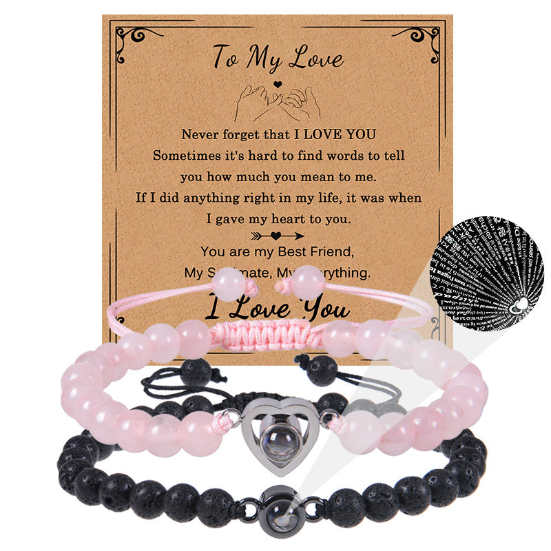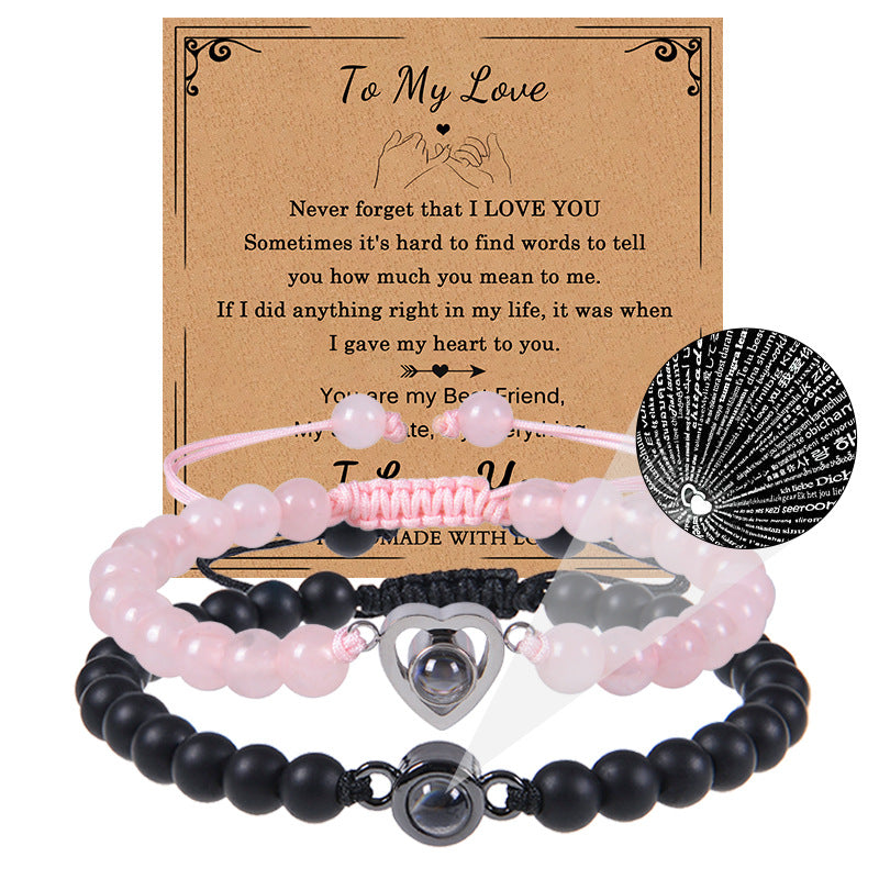Romantic Heart Shape Natural Stone Projection Bracelets with 100 Languages Card Gift Set