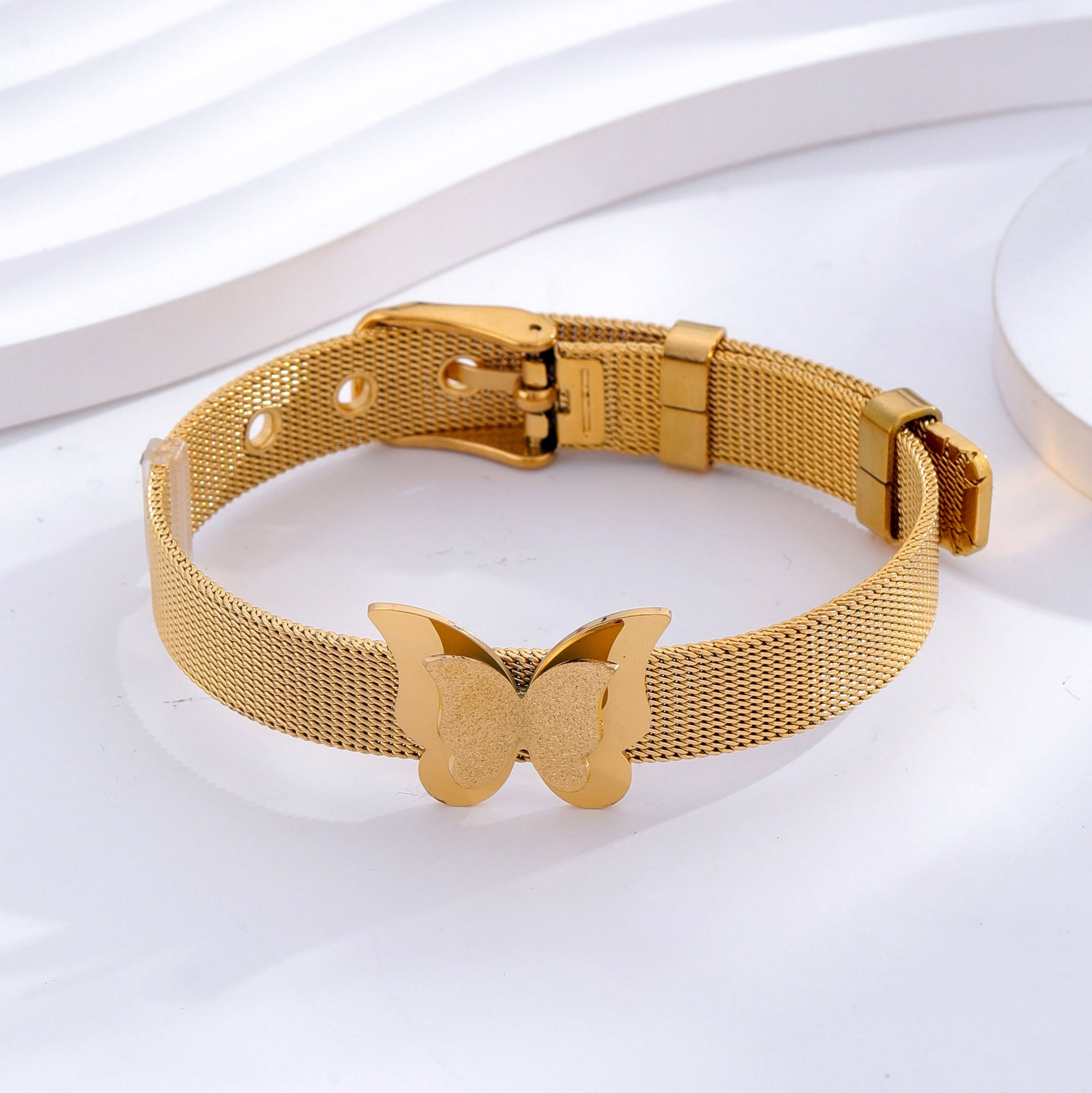 Elegant Four Leaf Clover Butterfly Titanium Steel 24K Gold Plated Bangle Bracelet