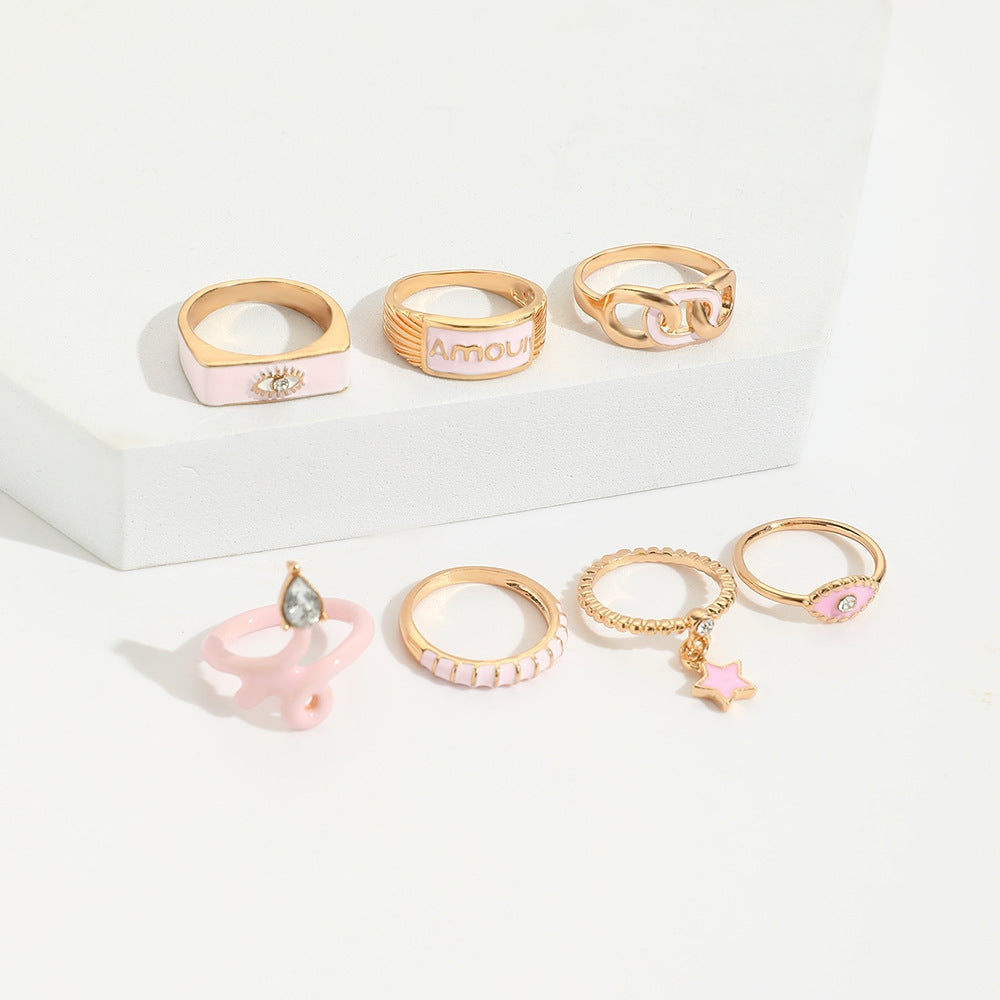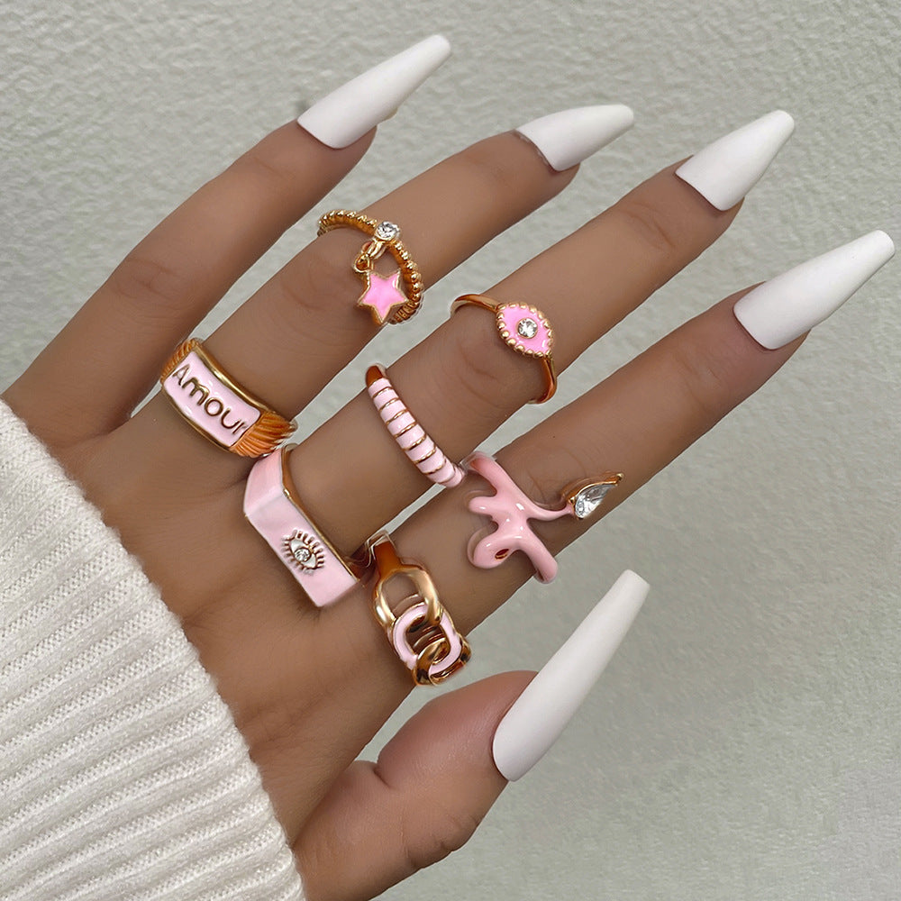 Simple Style Star Alloy Rhinestone Women's Ring Set with Pink Enamel and Pendant Charms