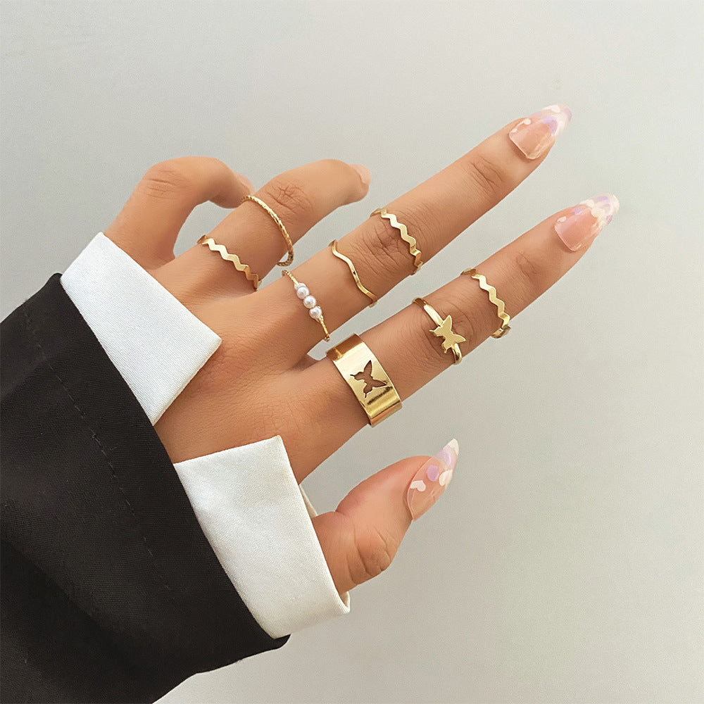 Simple Geometric Alloy Pearl Rhinestone Open Ring Set - 10 Pieces Vintage Chain & Butterfly Design