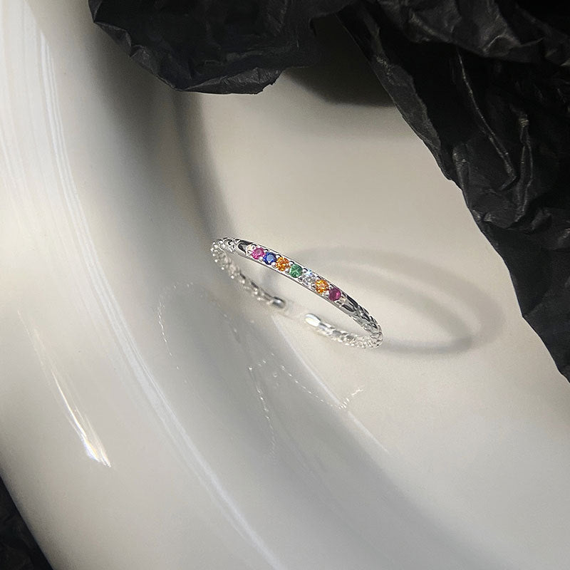 Geometric Sterling Silver Zircon Open Ring with Rainbow Design