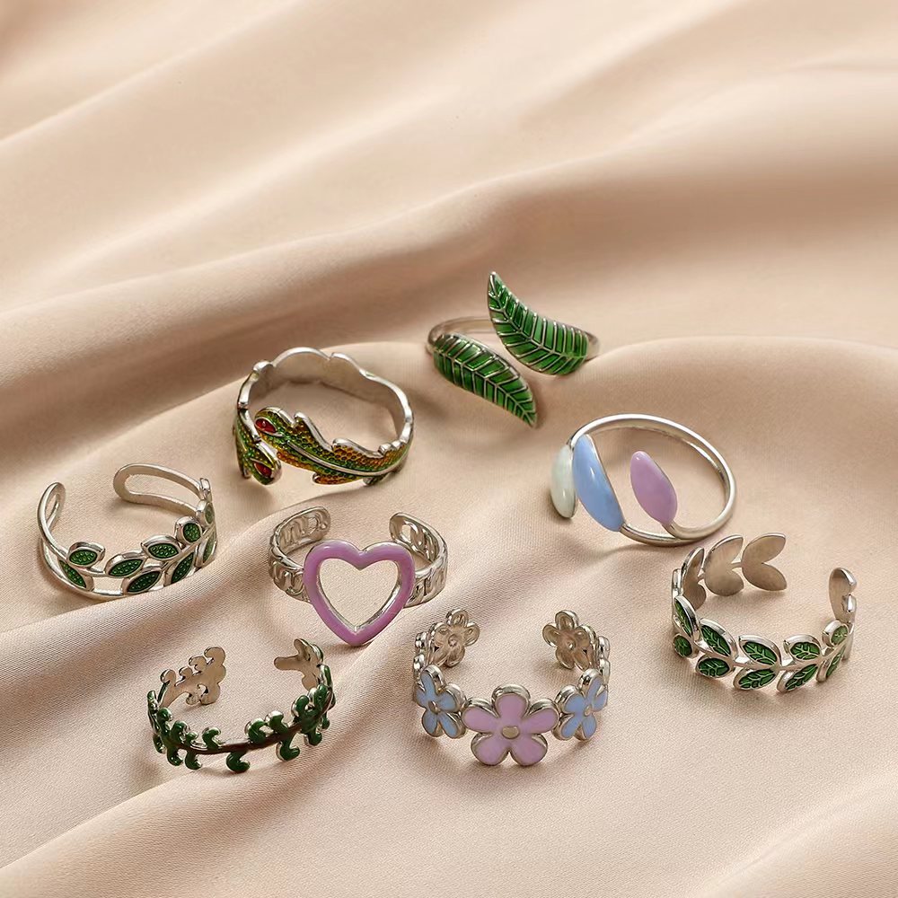 Simple Leaf Heart Stainless Steel Enamel Adjustable Ring