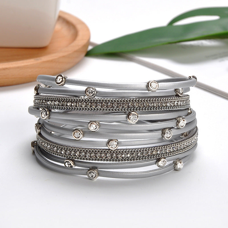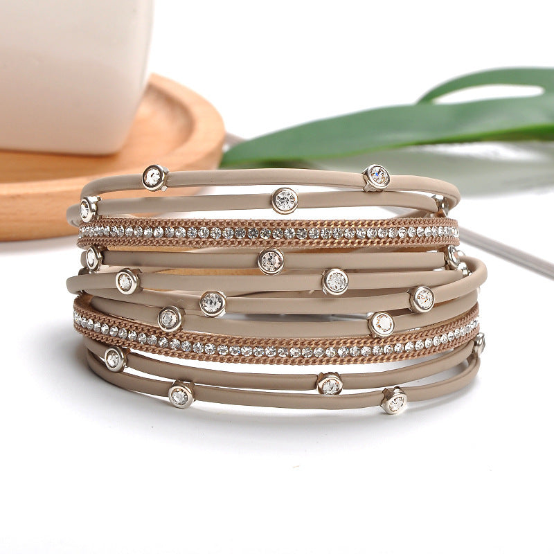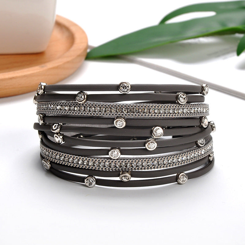 Simple Style Multi-Layer PU Leather Wrap Bracelet with Alloy Inlay Rhinestones for Women