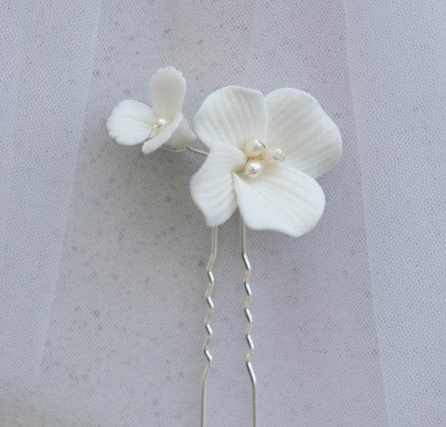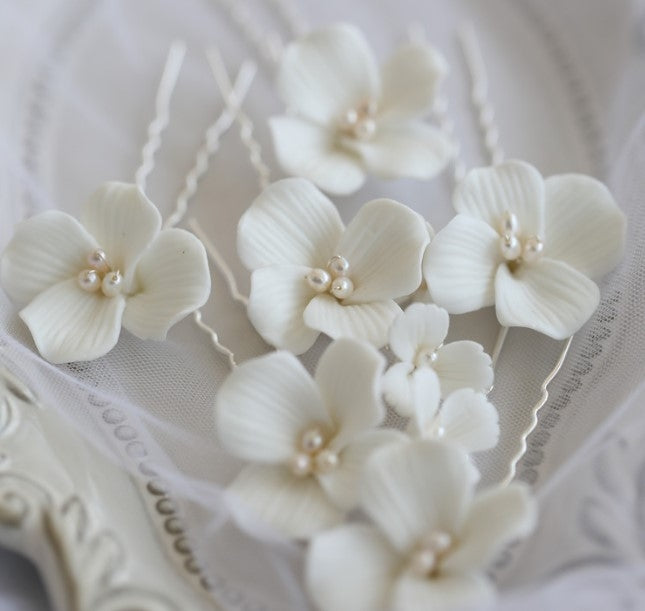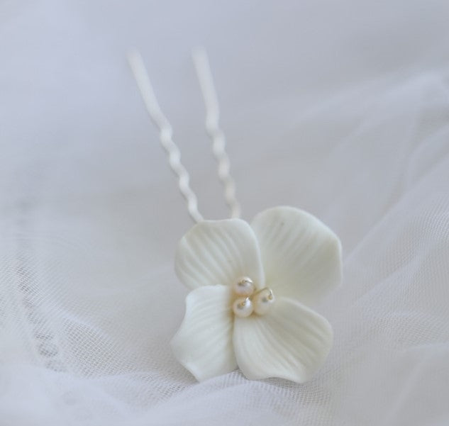 Sweet Flower Metal Hairpin with Artificial Pearls and White Ceramic Floral Bridal Hair Accessory