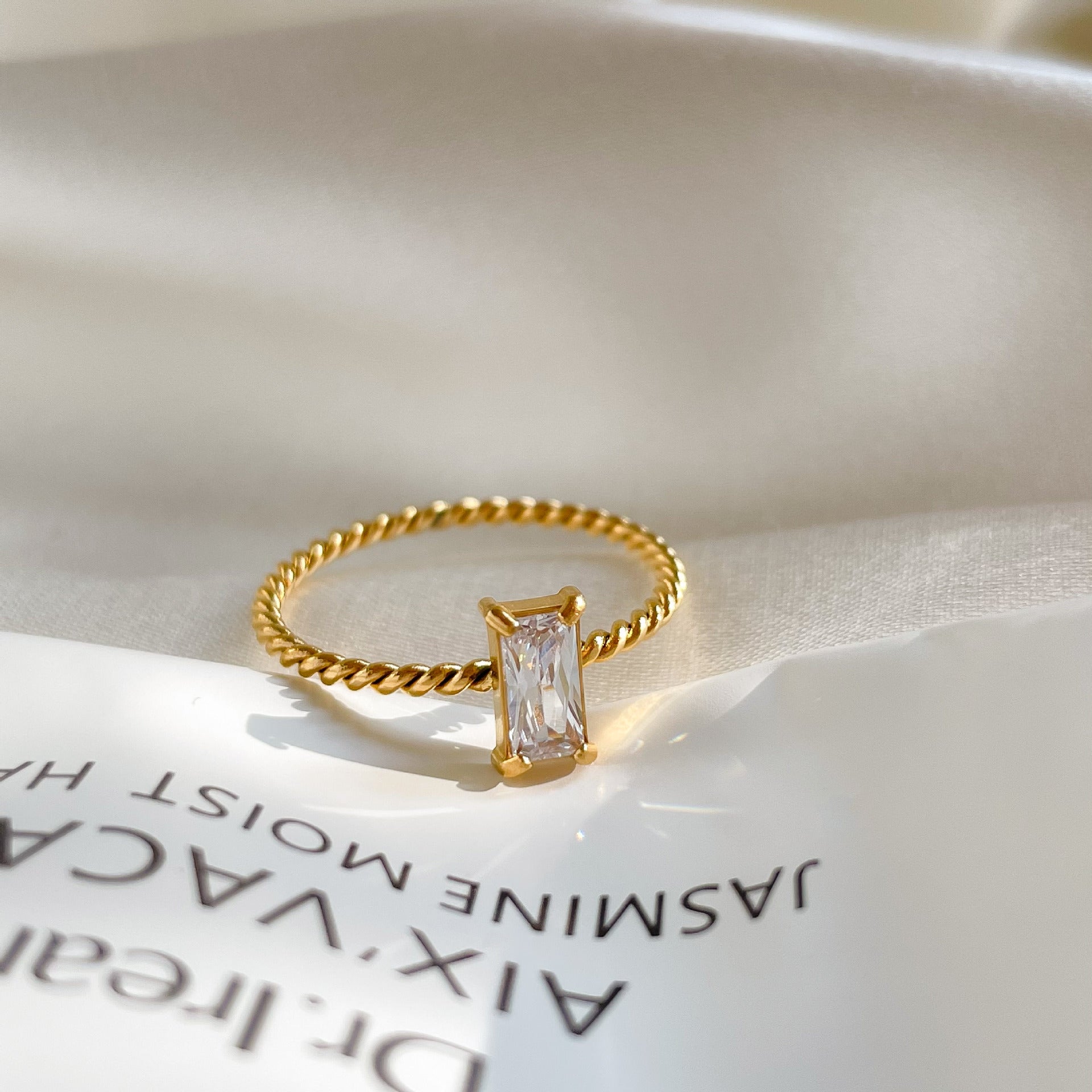 Sweet Square Titanium Steel Ring with Colorful Zircon and Twisted Band