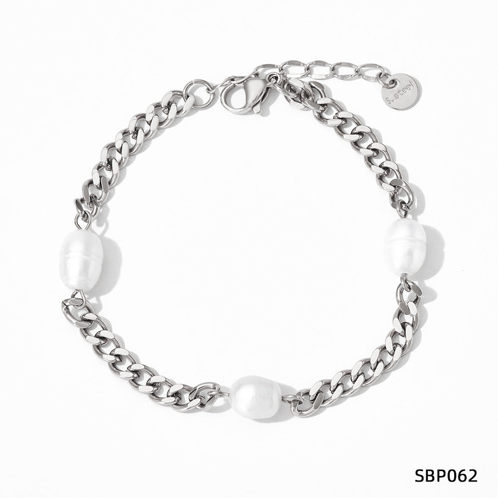 Vacation Stainless Steel Beaded Freshwater Pearl 18K Gold Plated Cuban Chain Bracelet