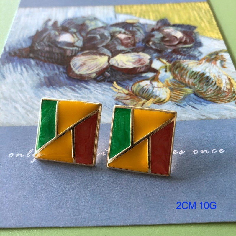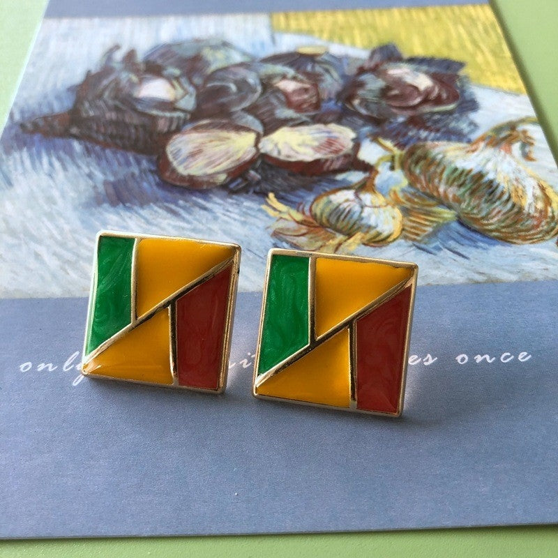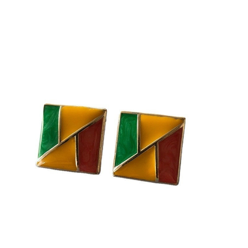 SQUARE COLOR-BLOCK SILVER PIN STUD EARRINGS 2CM