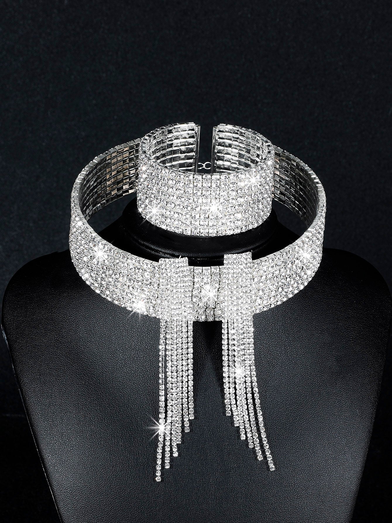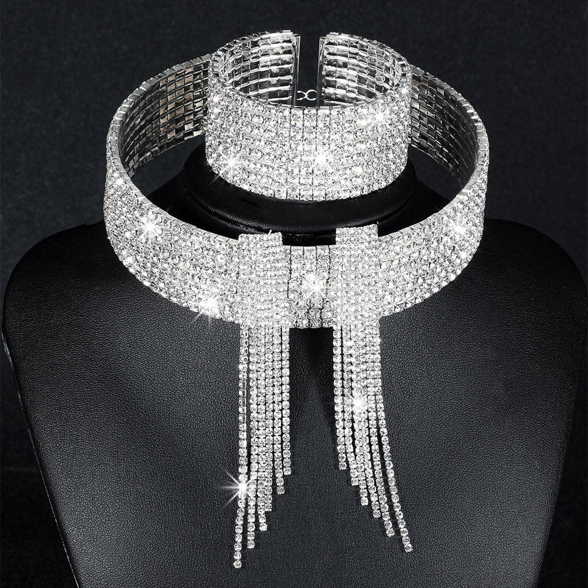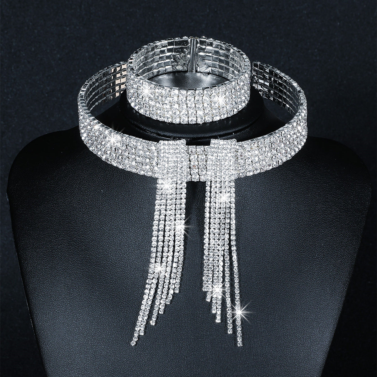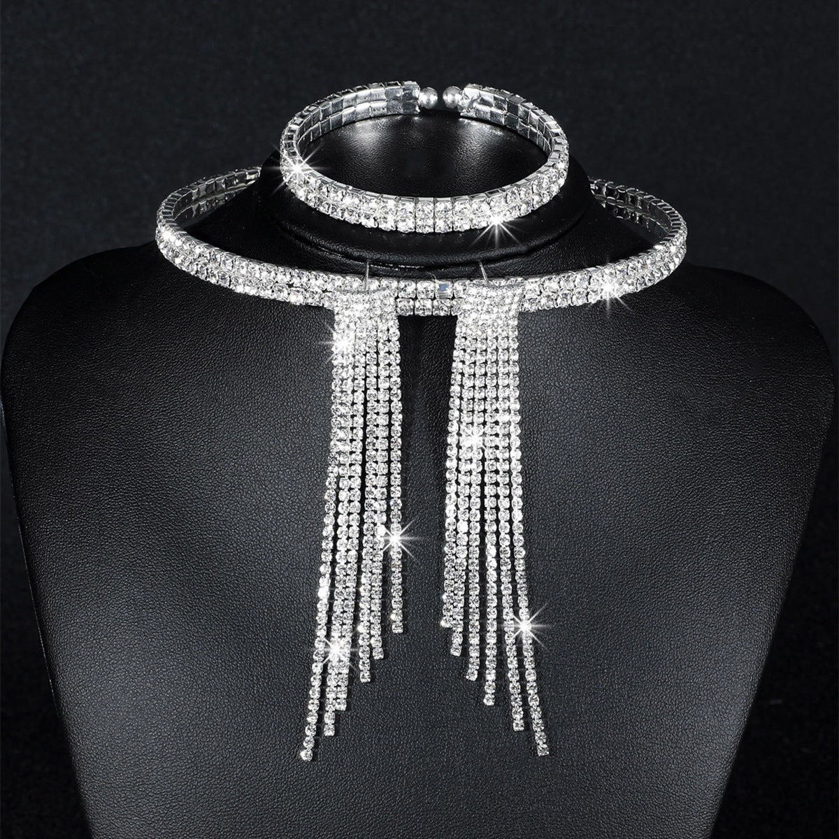 Silver Plated Rhinestone Jewelry Set: Geometric Choker Necklace, Tassel Bracelet, and Crystal Pendant Earrings for Women