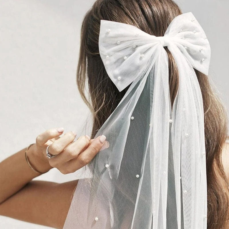 Women's Elegant Bridal Bow Knot Pearl Gauze Hair Clip