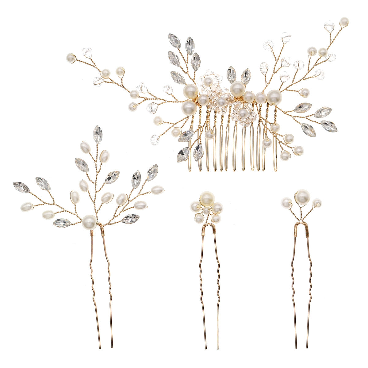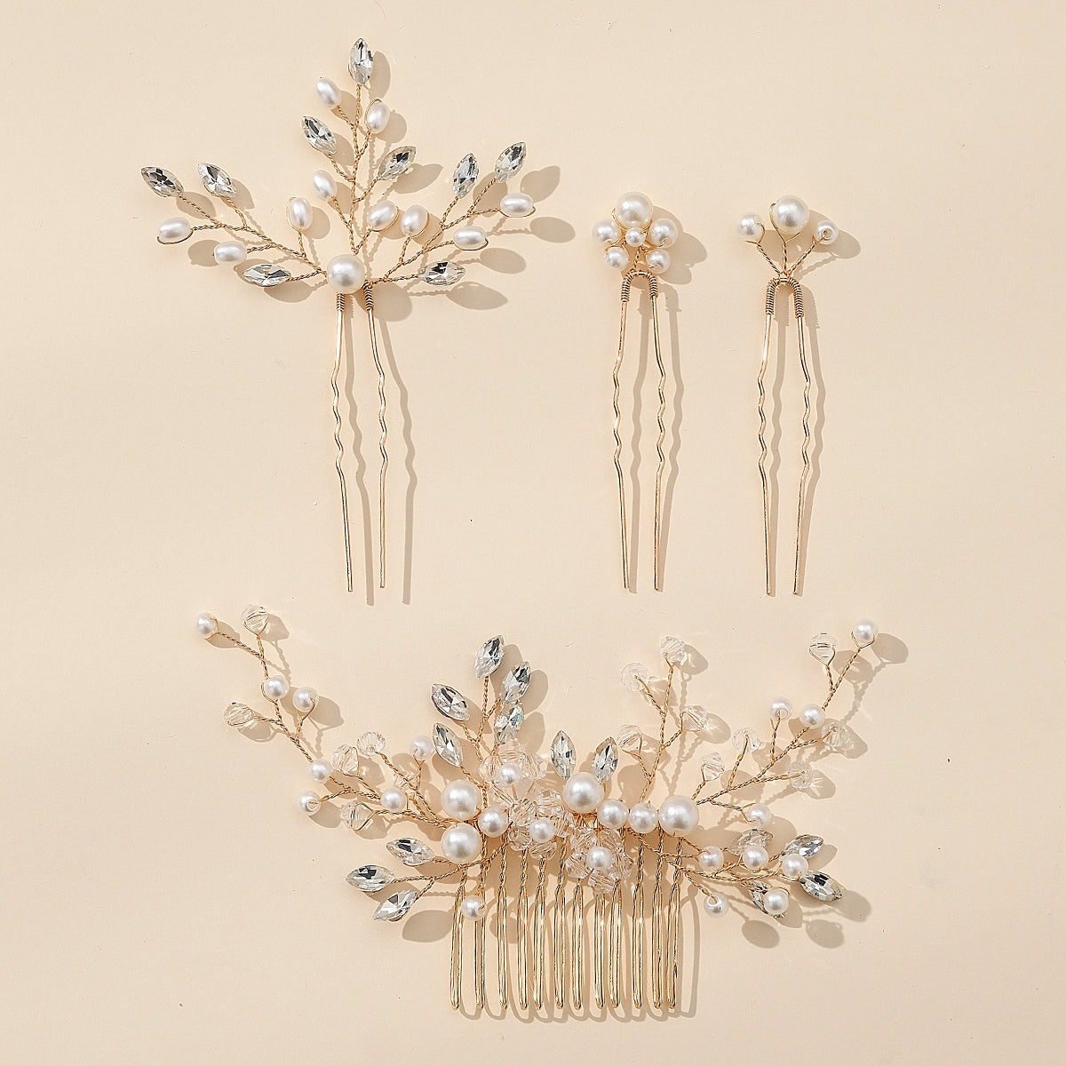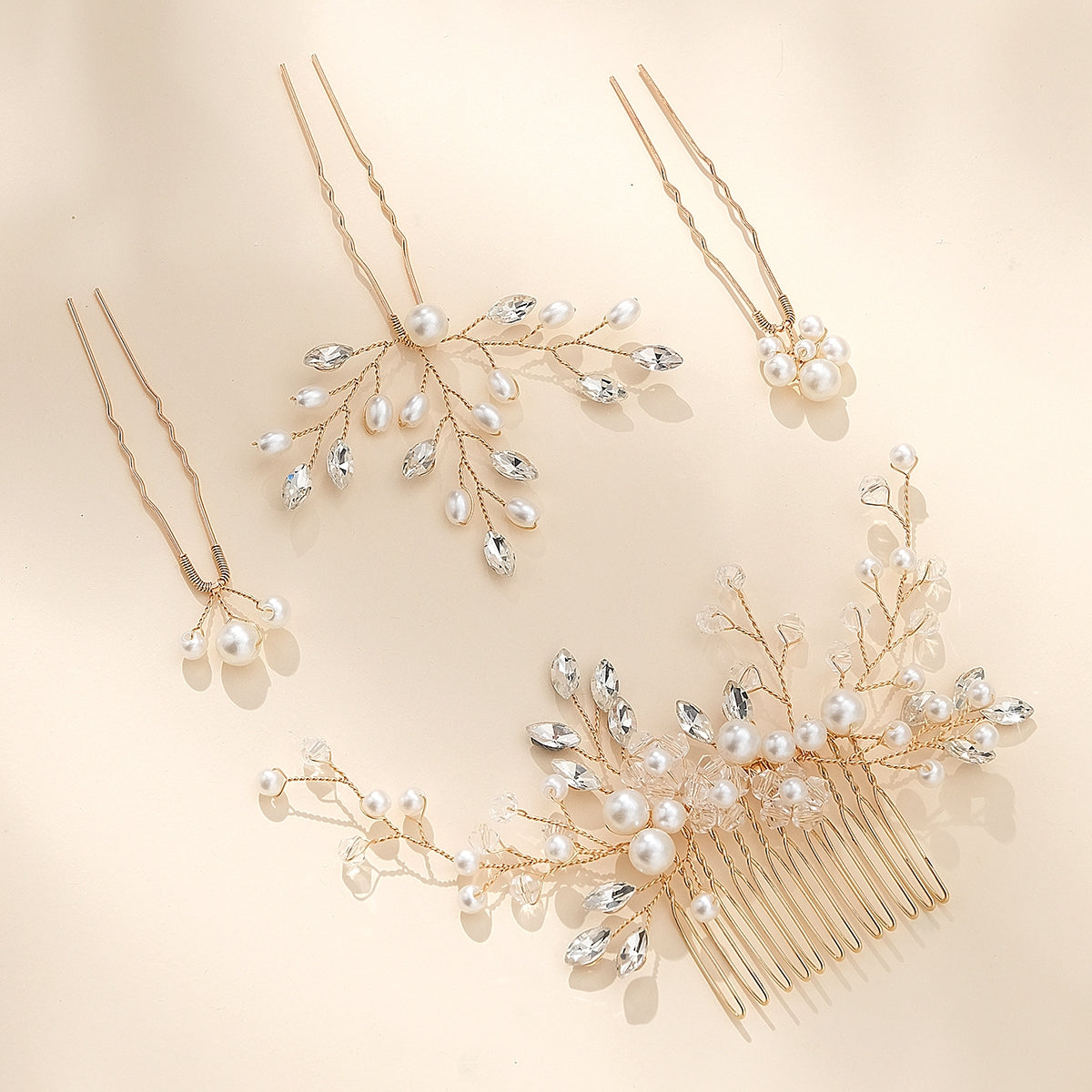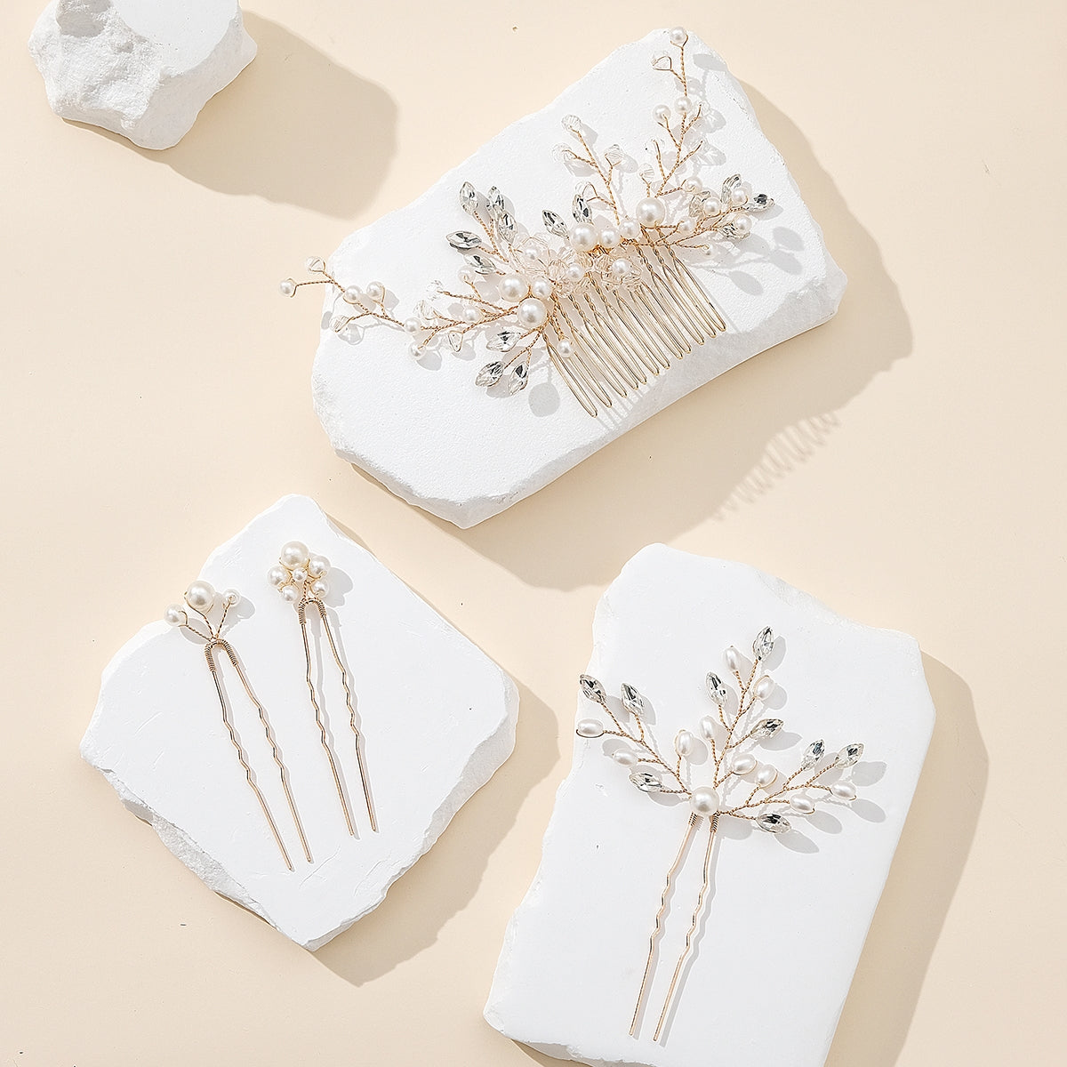 Women's Elegant Bridal Geometric Crystal Pearl Rhinestone Handmade Hairpin Comb Set