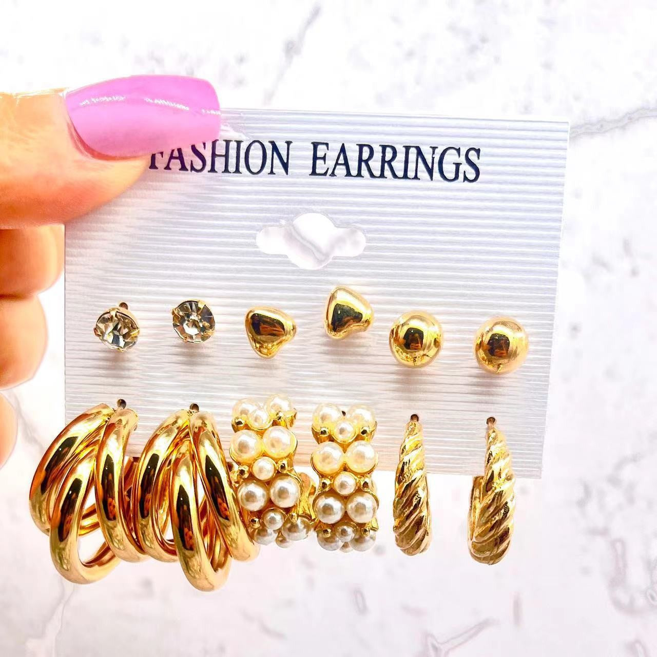 Women's Geometric Heart & Pearl Hoop Earrings Set with Rhinestones